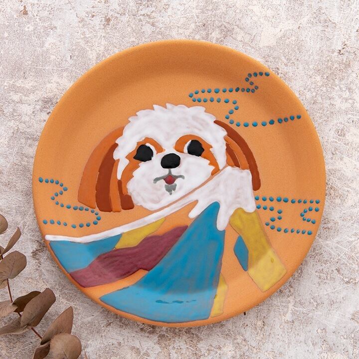 テラコッタ(素焼き)の陶器の皿に、松尾たいこが釉薬で描いた直筆作品。一点物となります。
